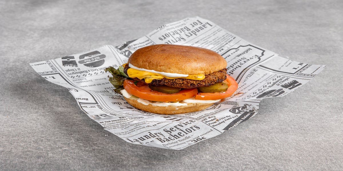 Briossisämpylä, salaattisekoitus, tomaatti, maustekurkku, maustamaton majoneesi, chilijugurtti, rapea kanafile, korianteri, kimchi.
